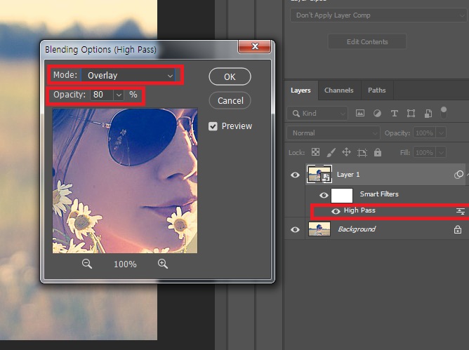 레이어패널에서 high pass라고 표시된 부분을 더블클릭해줍니다. Blending Options창이 나타나면 Mode에서 Overlay를 선택해줍니다. 그리고 Opacity값을 조절해 주고 ok를 눌러줍니다.