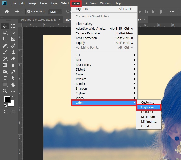 스마트 오브젝트 레이어로 바뀌었다면 Filter-Other-High Pass를 클릭해줍니다.